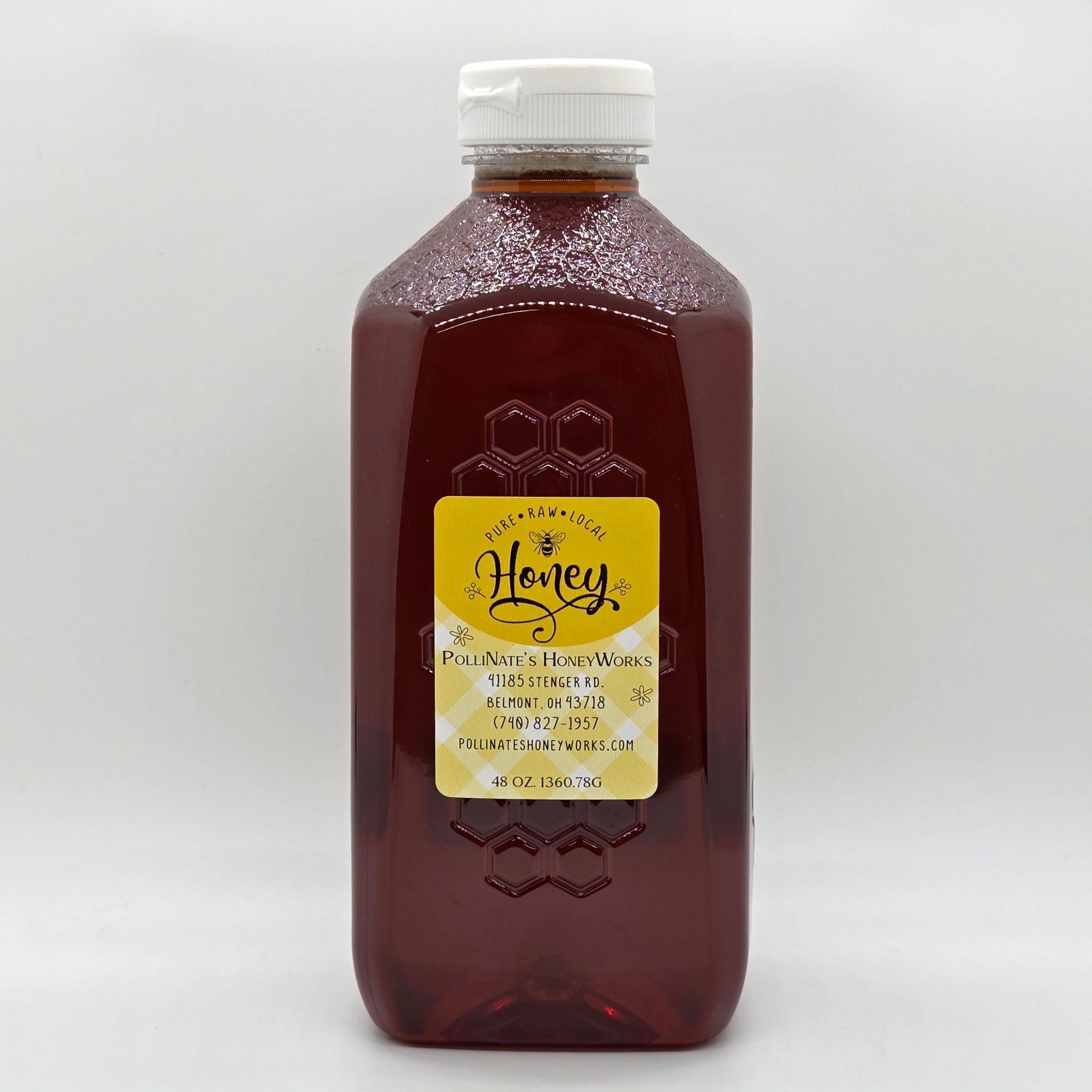 48 oz. Ohio Valley pure, raw, and unfiltered wildflower honey from a small apiary in the Belmont County Ohio/Ohio Valley region. Our honey is all natural, unaltered, and unheated (not pasteurized) to maintain the integrity and benefits associated with local, raw, honey.
